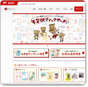「年賀状クイックサーチ2019」」は、郵便局が提供する年賀状フリー素材提供のサイトで、年賀状作成のために使える100種類以上のテンプレートと素材(パーツ)が無料でダウンロードできます。はがき作成機能はありませんが、年賀状クイックサーチのテンプレートや素材は「はがきデザインキット」などに使用できます。